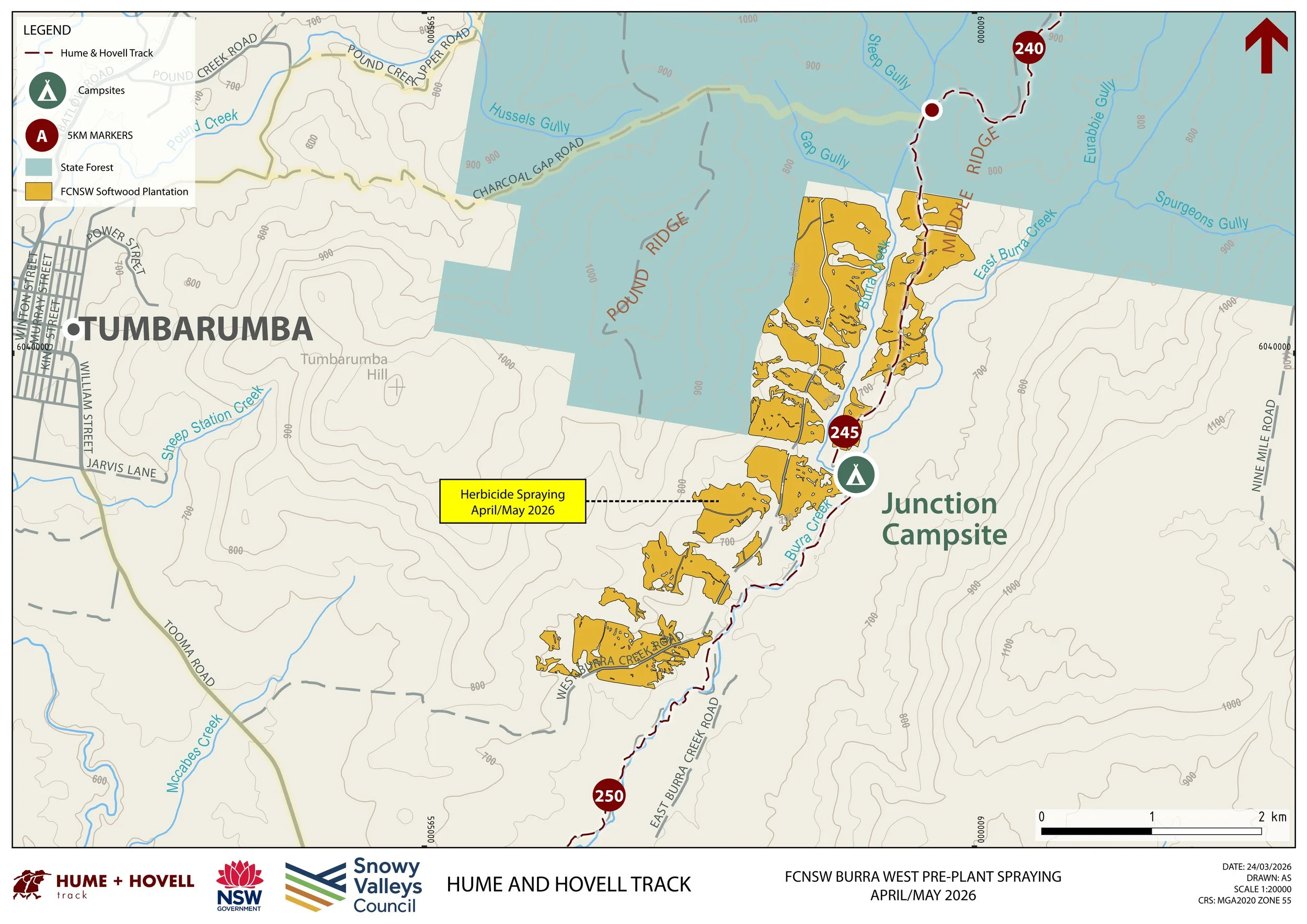Forestry Corporation of NSW has advised that they will be spraying herbicide at the Burra West softwood plantation adjacent to the Hume & Hovell Track during April/May 2026. This operation is to prepare for planting in winter.