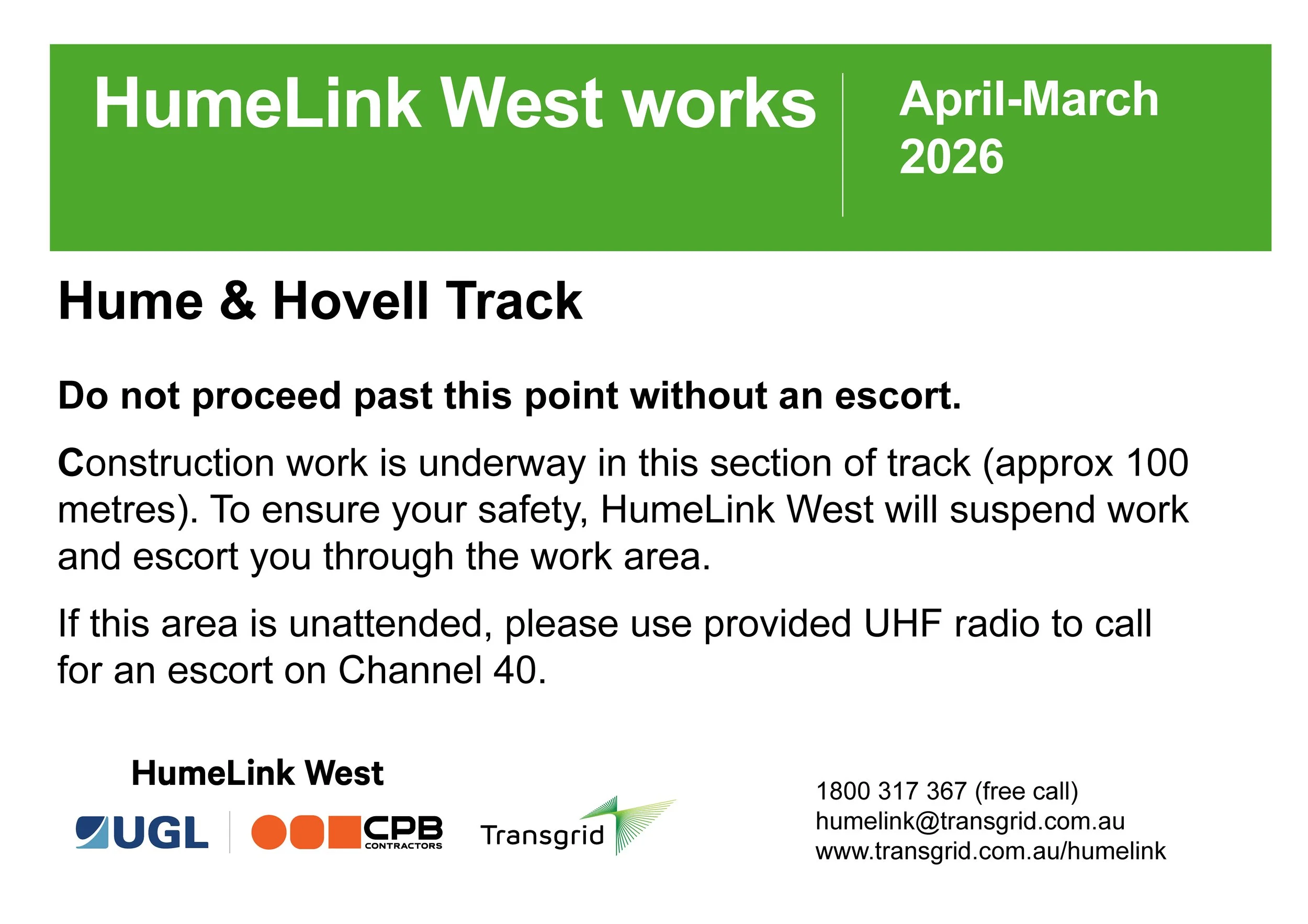 The Track will remain open, however, walkers will require an escort to pass through the work zone. Track users are advised to take care and follow all directions provided by HumeLink personnel on site.
