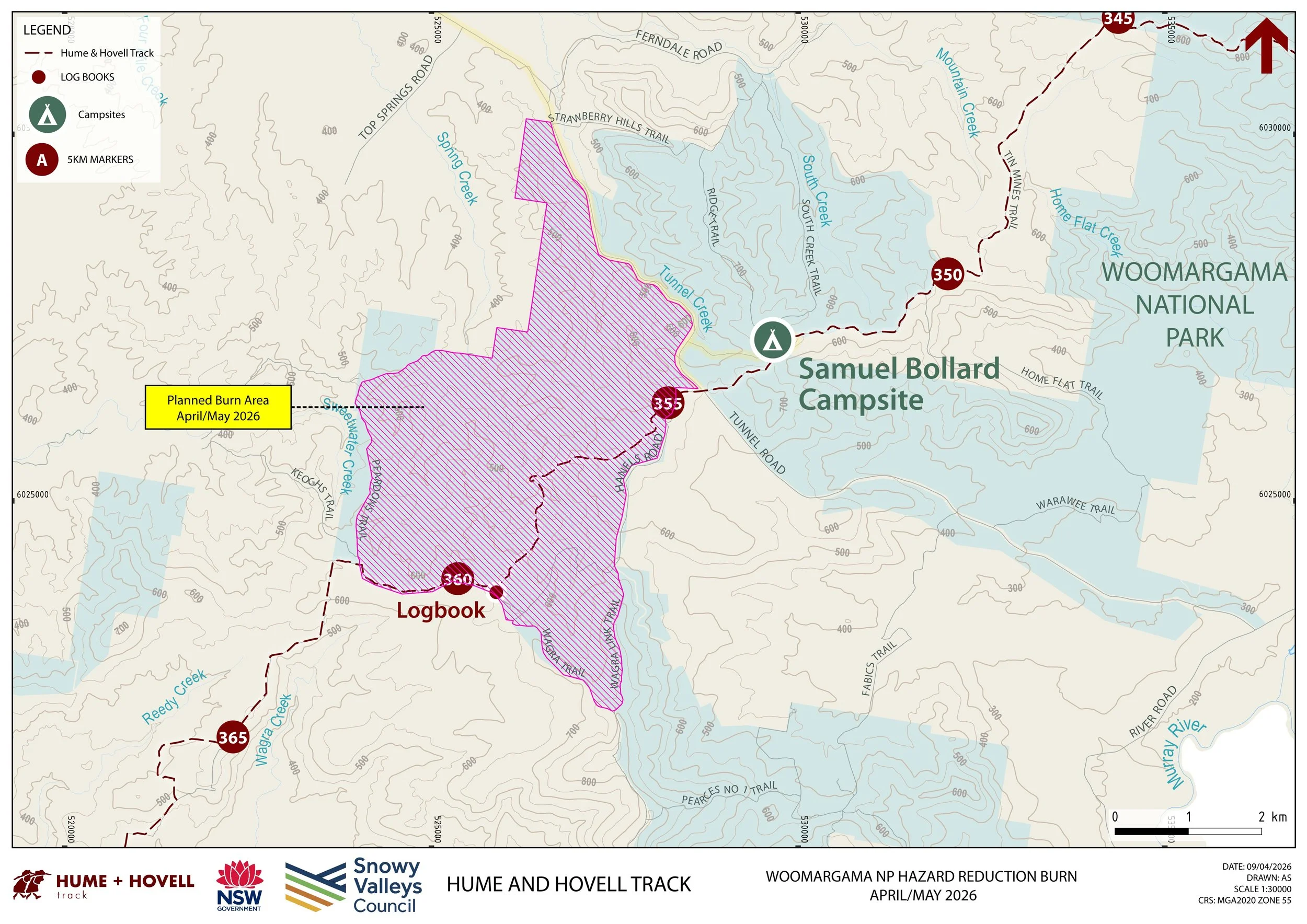NSW National Parks and Wildlife Service has advised that they will be conducting a hazard reduction burn in the southern area of Woomargama National Park during April/May 2026. The area of the planned burn includes a section of the Hume and Hovell Track through Spring Creek between Tunnel Road and Peardons Trail (shown in pink on the map below).
